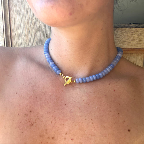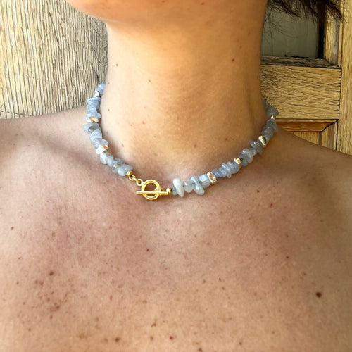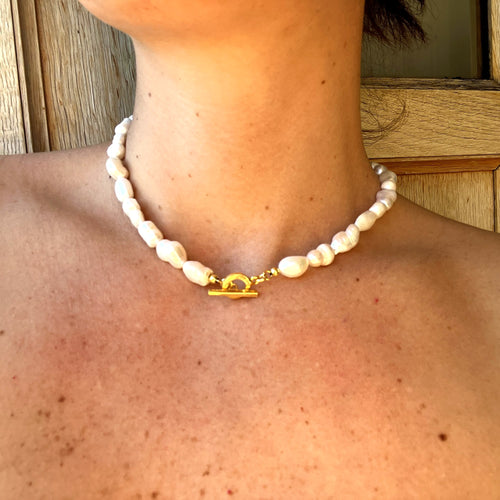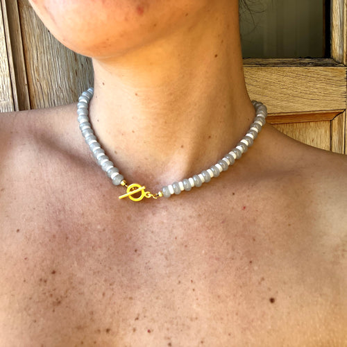 The beads are natural - aquamarine, baroque freshwater pearls, seed beads - finished with a gold vermeil sterling silver toggle clasp that sits at the front.